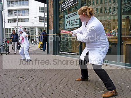 Op deze dag wordt stilgestaan bij alle dieren die hun leven doorbrengen in laboratoria. Ook op de Grote Marktstraat hoek Spuistraat werd dit herdacht door een verkleedde vrouw die met een ander touwtrok: de strijd figuurlijk tegen het gebruik van proefdieren.