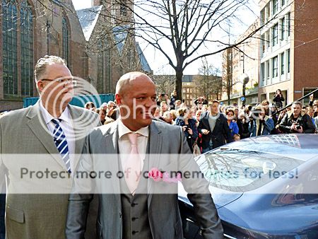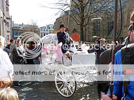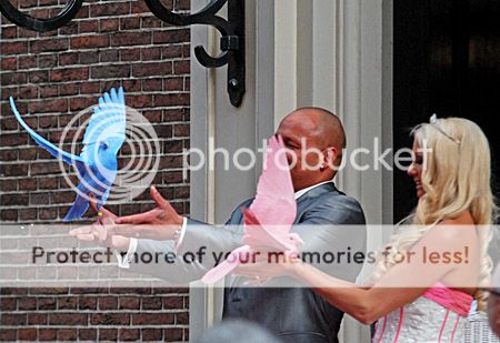 Tijd om te wachten dat ze weer uit het stadhuis kwamen had ik niet, maar een prachtige fotoserie van bijna het geheel kan je zien op deze link van Richard Mulder, zoals ook bovenstaande foto waar ze een roze en blauwe duif oplieten.