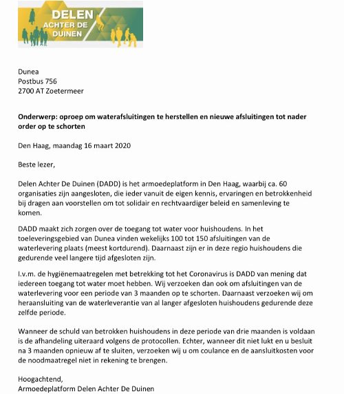 Ook werd verzocht om heraansluiting van waterleverantie van de reeds afgesloten huishoudens.
