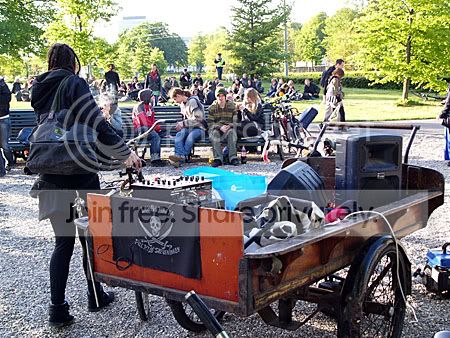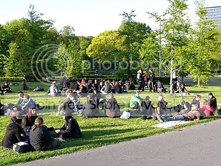 Dit was rond 19.30 uur een behoorlijk grote groep van rond de 150 personen waar een gemoedelijke sfeer heerste. Op een duwkar (let op de vlag!) werd muziek afgespeeld en veel mensen lagen te genieten in de avondzon.