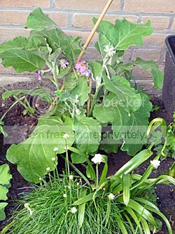 En wat stond daar nu wel in de schappen? Stokrozen! En nog een rode ook. Je begrijpt, één is ook de kar in gegaan. Evenals wat bloemen die bijen aantrekken en een aubergineplant, hier links op de foto.