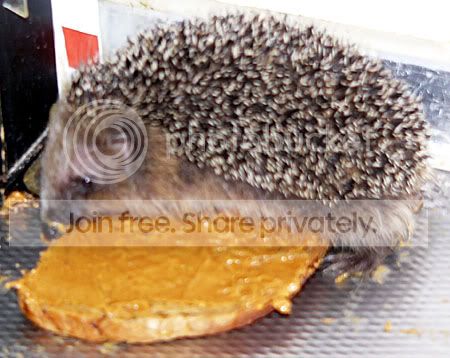 Na een oude bruine boterham met pindakaas (ja, dat mocht; kattenvoer hadden we niet in huis) waar hij enorm van genoot hebben mijn dochter en haar vriendin de egel weer teruggezet op een veilige plek.