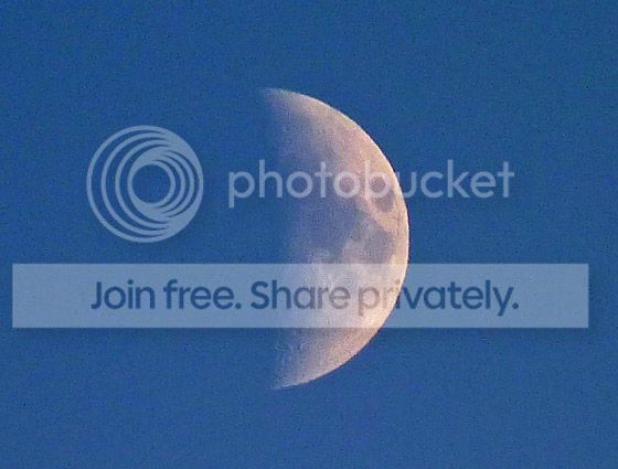 De laatste foto is van de bijna halfvolle maan op 25 juli. Met de compact gemaakt, dus veel ruis, maar hij was zo mooi dat ik het niet kon nalaten er een kiekje van te maken. De hele avond en nacht was hij oranje gekleurd.