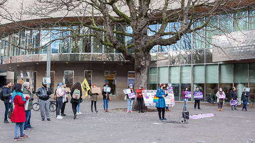 Bij de grondwetbank stond op vrijdag 26 maart een groep vrouwen te demonstreren. “Het is tijd om de vrije samenleving tegen femicide te vededigen!”