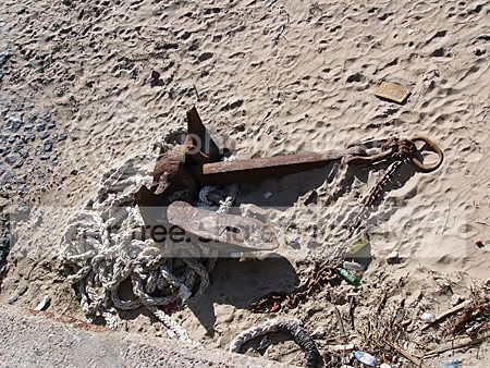 Op het strandje tussen de havenhoofden lag een enorm groot anker.