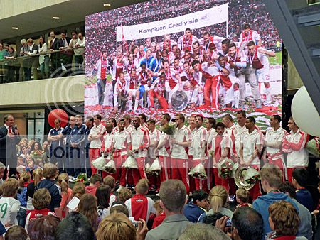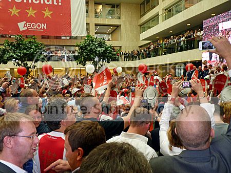 Niet alleen in Amsterdam, maar ook in het hoofdkantoor van Aegon vlak bij Station Mariahoeve in Leidschendam werd Ajax vandaag gehuldigd in een overvolle zaal. Althans, sponsor Aegon zette de club in het hoofdkantoor in het zonnetje voor genodigden.