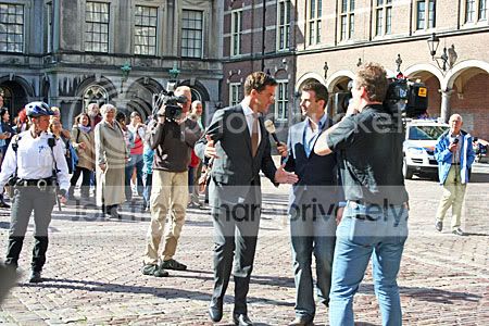 Maar Mark Rutte had enorme haast en wilde de pers niet echt te woord staan. Hij liep hard over het Binnenhof naar de Eerste Kamer.