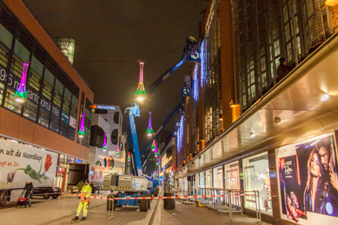 Grote wagens verwijderden de lange lichtsnoeren die hingen langs de gevel van de Bijenkorf.
