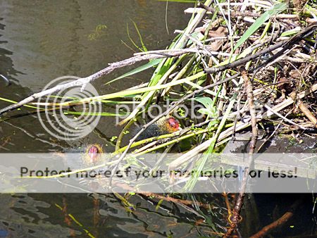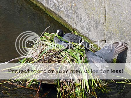 Daar zag ik weer iets heel leuks; een meerkoet zat op het nest en de partner gaf het nieuw nestmateriaal aan.