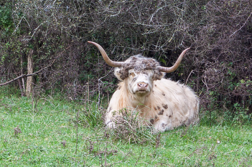 Tijdens het zoeken naar zwammen zag ik de Schotse Hooglanders weer staan. De witte blijft mijn favoriet, maar wat zag hij er vreselijk gehavend uit! Zijn vacht zat vol klitten. Triest te zien….