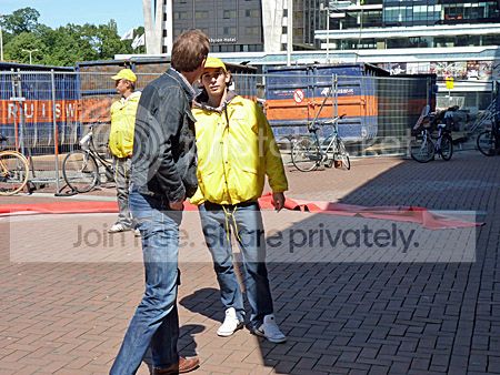 Voor de ingang wezen mensen die met de trein moesten de weg naar de perrons.