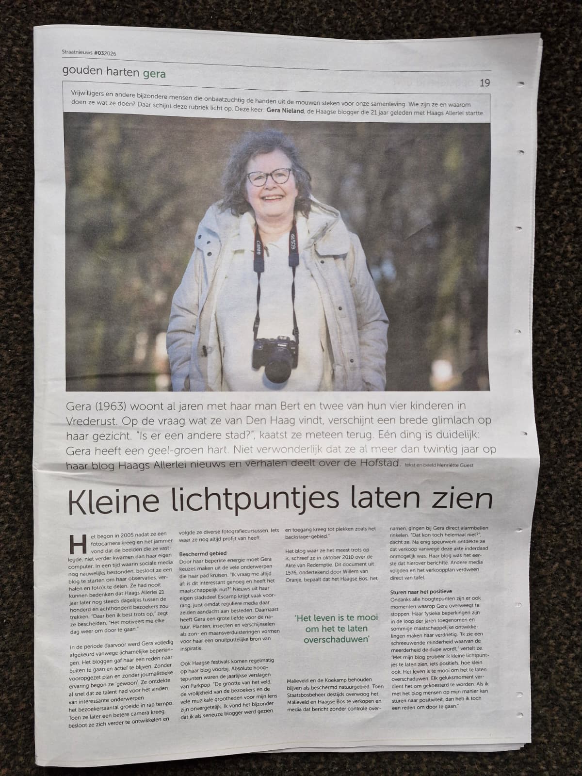 Zoals je misschien wel/niet weet maak ik voor Straatnieuws een rubriek geheten Gouden Harten. Hiervoor interview ik vrijwilligers in Den Haag die stad nog mooier maken dan het nu al is. Omdat jij al zo lang Den Haag op een positieve manier onder de aandacht brengt zou ik het heel leuk vinden jou hiervoor te interviewen/fotograferen. Zou je hier aan mee willen werken? Voor een impressie van eerdere verhalen verwijs ik je naar mijn website