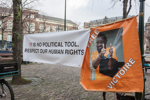RESPECT OUR HUMAN RIGHTSMet ernaast een banner: “Free Victoire”.