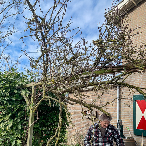 Eind vorig jaar had ik hem al deels gekapt, omdat een tak door judasoren was aangetast en deze tak zag er niet bijster gezond uit. Ik wist dat in de loop van de tijd meerdere takken ingekort moesten worden, maar besloot het stukje bij beetje te doen, ook voor de vogels.