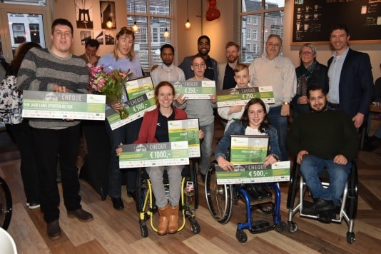 Winnaars bij elkaar: Jeroen Kuiper (L), Jolanda van Leeuwen (2eL, Félice Lentz (blauwe rolstoel), naamgever Wouter Duinisveld ® en voorzitter Hans Willink (grijze trui), met daar tussendoor de rolstoelhockeyers Haag88. Foto: Richard Mulder Driemaal scheepsrecht voor Haag88 en ook jeugdprijzen voor Haagse sporters