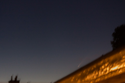 Net boven de dakgoot zie je de komeet Neowise met de lange staart En toen waren er allemaal berichten, dat een komeet met de blote ogen te zien was.