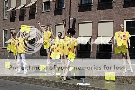 Niet alleen was in Den Haag vandaag het cultuurprotest (en laatste stukje van de Mars der Beschaving), ook medewerkers van de Wereldomroep voerden vandaag actie. Op het Plein bij het gebouw zonden ze de hele dag live uit.Maar aan de andere kant van het Tweede Kamergebouw hadden de actievoerders poppen geplaatst, om hun verzet tegen de bezuinigingen op de wereldomroep kracht bij te zetten. De poppen hadden een geel t-shirt aan die in de uitverkoop leken te zijn met daarop allemaal leuzen als ‘Wat voor (Wereld)omroep wil jij?’, ‘Journalistiek houdt niet op bij de grens’ en “Een beter geinformeerde Wereld’.