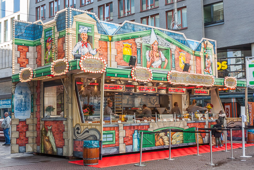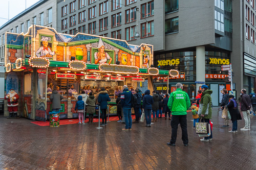 Even was het spannend of hij daar weer mocht staan: de Gemeente Den Haag had eigenlijk een andere plek in gedachten. Het Spuiplein namelijk. Maar eerlijk is eerlijk, hoe gezellig staat deze kraam bij de entree van de winkelstraat. En deze plek is toch veel beter?