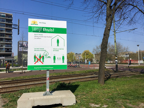 Ook op de Leyweg staat een bord “Blijf Thuis”. De boodschap is duidelijk. In heel de stad zie je nu deze borden. De boodschap is duidelijk: Blijf Thuis!