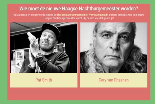 Stem op de nieuwe Nachtburgemeester. Foto van de site Haagse Nachtburgemeester Na twee jaar een onzichtbare Nachtburgemeester te hebben gehad, die, zoals ik begreep van Rene Bom, de weg heeft geplaveid voor een zichtbare, is het tijd om een nieuwe te kiezen!