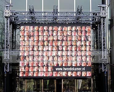 Op het Plein in Den Haag, voor het gebouw van de Tweede Kamer staat op dit moment een gigantisch scherm opgesteld dat wisselende afbeeldingen geeft. Zoals de gezichten van de alle kamerleden, de nieuwe voorzitter van de Tweede Kamer, de terugkerende en de nieuwe kamerleden.