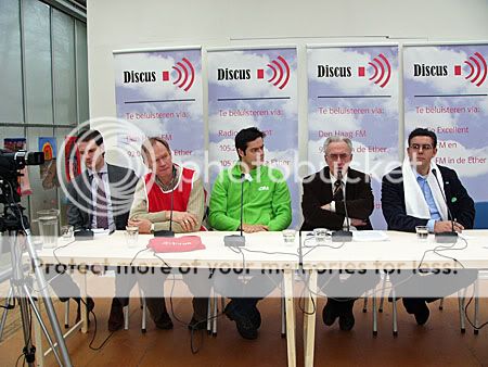 Daarna gingen van links naar rechts op de foto Bart Brands (PVV), Gerard Verspuij (PvdA), Karsten Klein (CDA), Wim Pijl (Christelijk Sociaal Den Haag), Rachid Guernouai (D66) en Arjen Lakerveld (VVD; niet op de foto!) met elkaar en het publiek in discussie over dit thema onder leiding van Joop Schouten van Radio Discus.