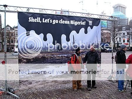 Milieudefensie had vanmorgen vroeg op het hoofdkantoor van Shell een spandoek gehangen om aandacht te vragen voor de ramp die deze lekkages daar hadden veroorzaakt.