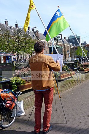 Toen ik weer richting het Binnenhof ging, viel mijn oog op een man die langs de Hofvijver stond.