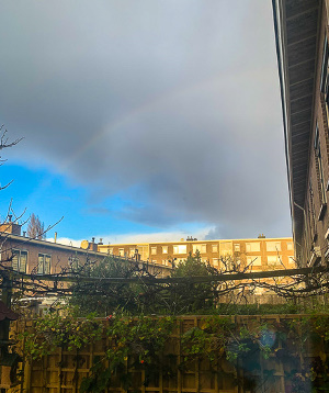 Tijdens een hagelbui scheen vanmorgen de zon. Een hagelboog 😀