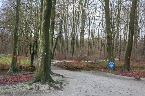 Toen ik er onlangs was, schrok ik behoorlijk. Langs alle paden heel veel witte stippen en oranje stippen op de bomen. Ook op de prachtige oude beuken. Wat gebeurde er nu weer? Weer zo’n enorme boomkap?